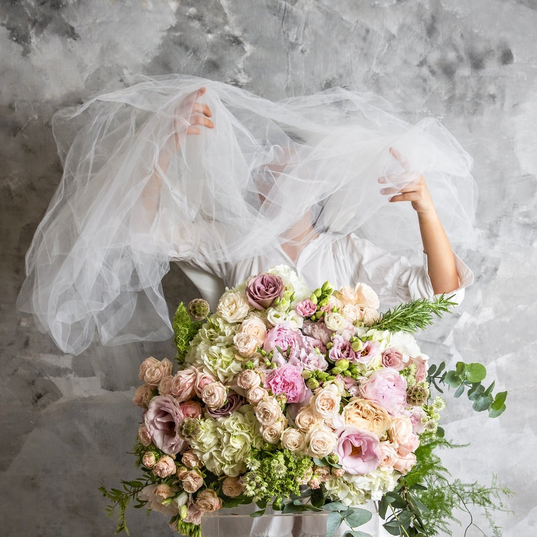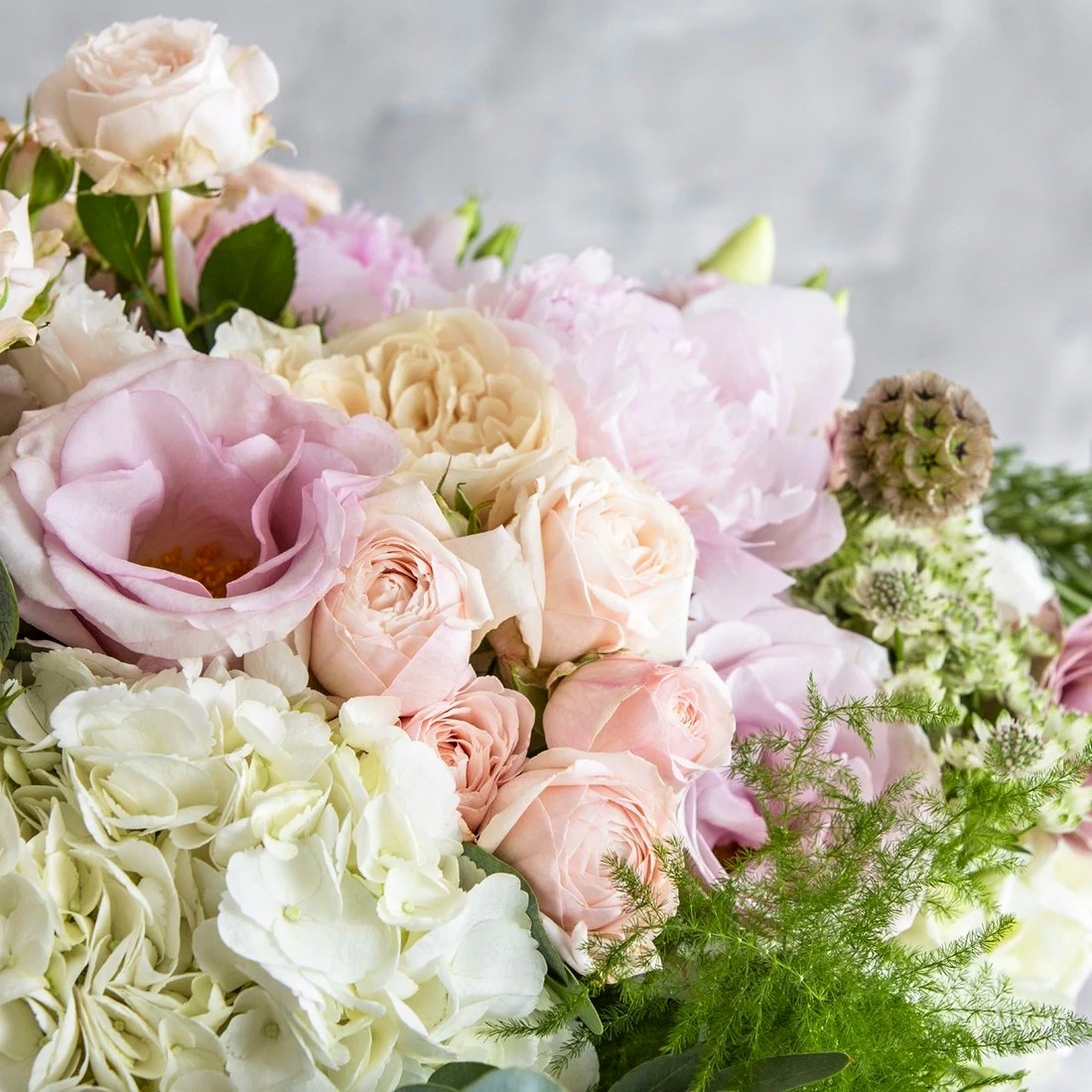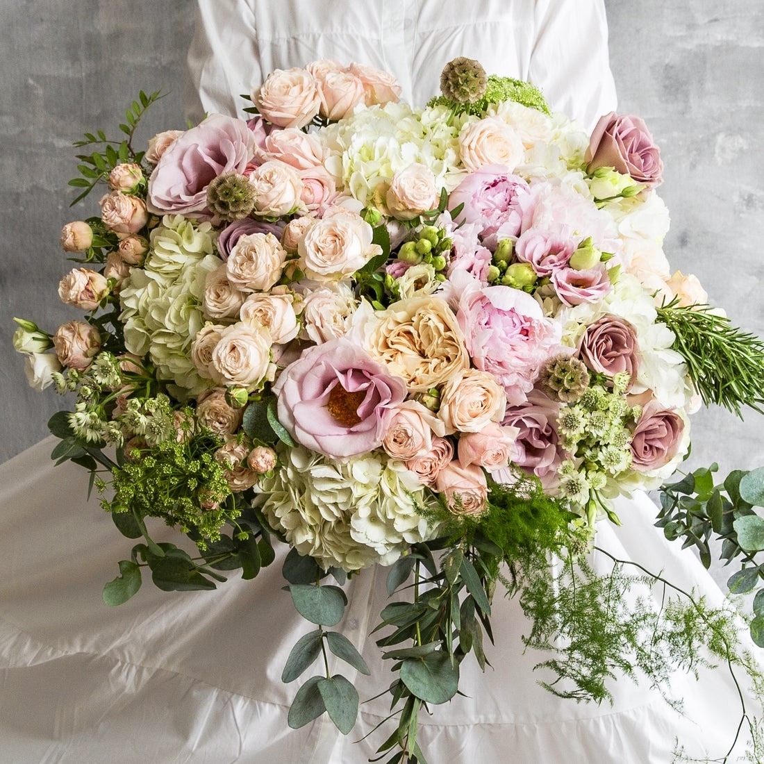 Hortenzia, eustoma, čajová ruža, trsová ruža, astilbe, eukalyptus, doplnková zeleň,